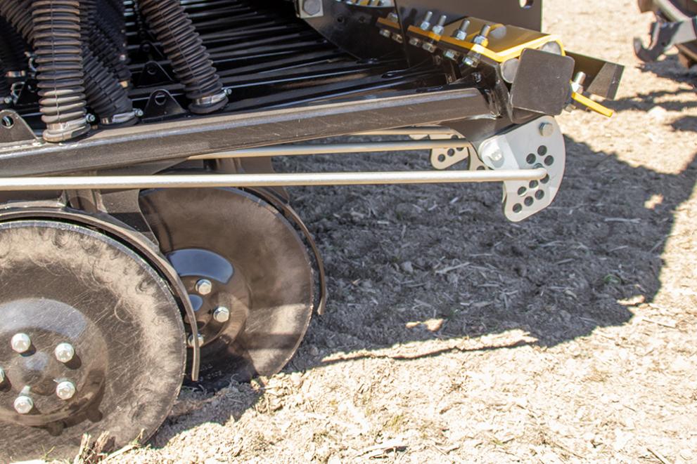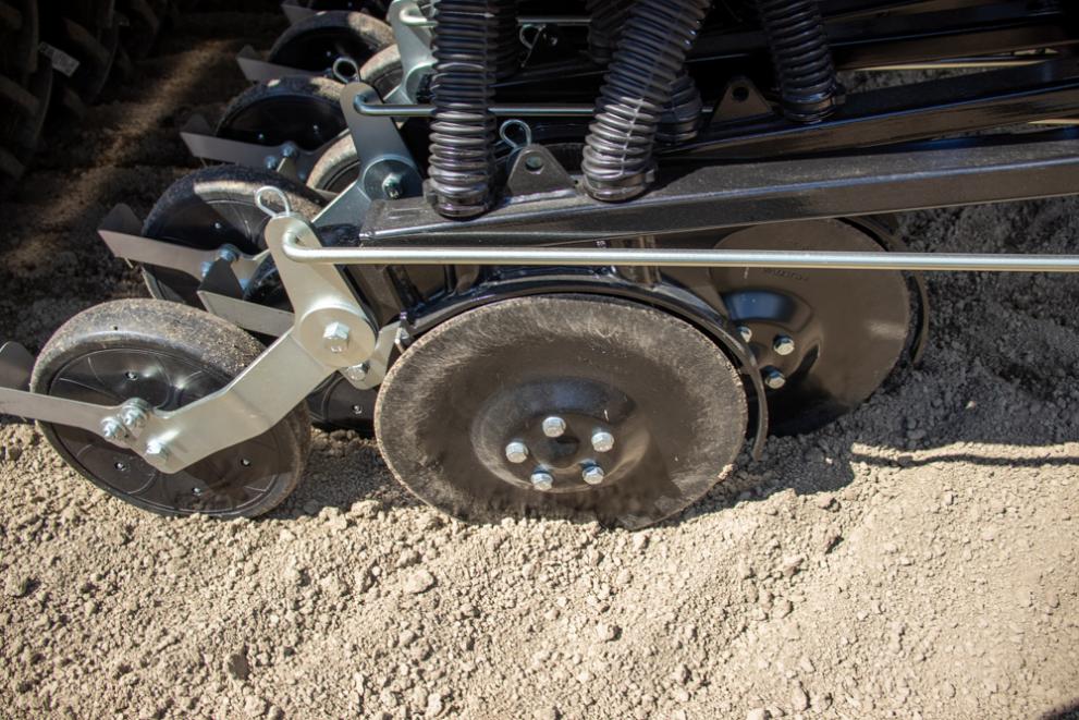 The exact seeding depth is ensured by the individual control for each coulter separately with the closing wheel. Thanks to the closing wheel which runs behind the double discs the seeding depth is constant and unaltered also in uneven fields. Individual coulter adjustment with the closing wheel is also beneficial because the hopper filling level or soil type variations don’t affect the seeding depth.